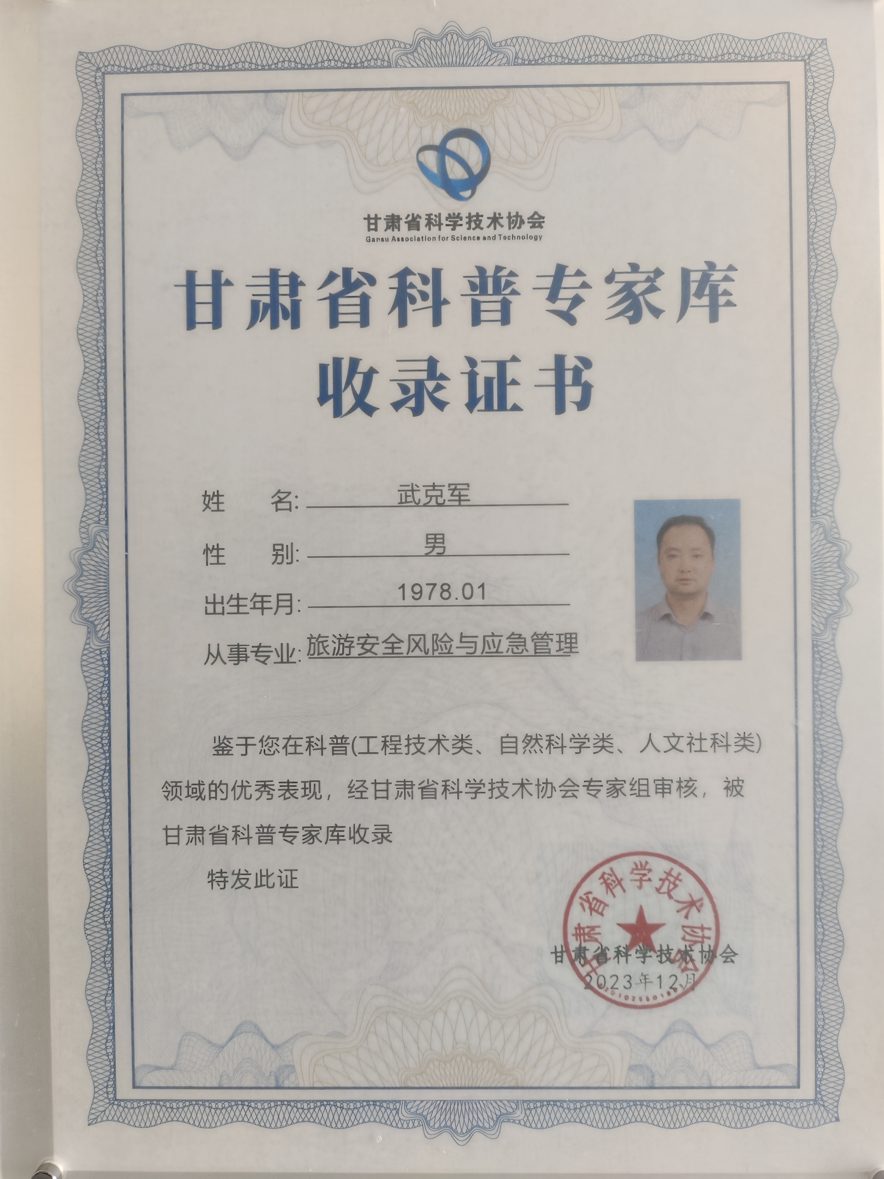 12月18日,“2023年甘肃省科普专家聘任仪式”在甘肃省科技馆举行,2018太阳集团网站古天乐武克军副教授被甘肃省科学技术协会聘任为甘肃省旅游安全风险与应急管理科普专家。这是继21年被聘为世界遗产教育金城首席科普专家后,对2018太阳集团网站古天乐旅游风险研究团队从事甘肃省科普工作的肯定。