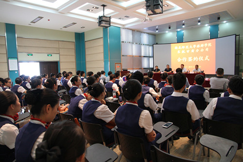 6月18日上午,学院与东方航空公司甘肃分公司在10C701室举行音乐表演专业(空中乘务方向)学生专业实习签约仪式。东航甘肃分公司党委副书记叶玉泉、人力资源部总经理刘军、服务与质量管理部副总经理张箭飞、地面服务部副总经理王卫东、团委书记杨洋、人力资源部人事科科长张明,学院党委书记贾志斌、副书记谢致远、航空服务与管理系主任柴亚林及航空服务与管理系部分师生代表100余人参加了仪式。签约仪式由副院长高亚芳教授主持。