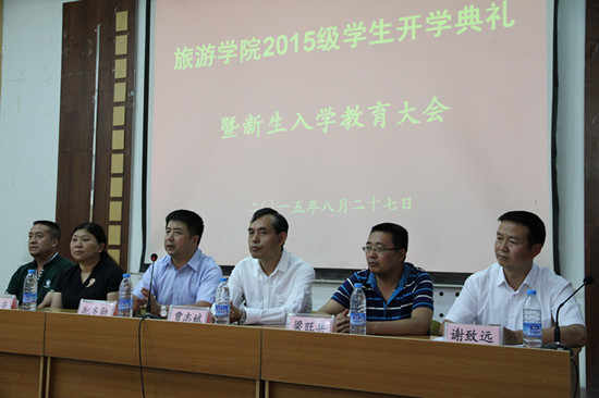 8月27日下午,学院2015级学生开学典礼暨新生入学教育大会在6号楼C区115多媒体报告厅隆重举行。学院党委书记贾志斌副研究员、院长把多勋教授、副院长梁旺兵教授、高亚芳教授、万建斌同志、副书记谢致远副研究员,旅游管理系系主任欧阳正宇博士、酒店管理系副系主任谢民老师、航空服务与管理系系主任柴亚林博士、文化产业管理系系主任王力博士,院办公室主任张建华老师、团委书记王瑞老师、北京广慧金通教育科技有限公司驻西北师大工作处主任张晓雯老师,2015级本科生班主任、辅导员、2015级全体新生及部分家长共300余人参加了本次大会。大会由党委副书记谢致远主持。