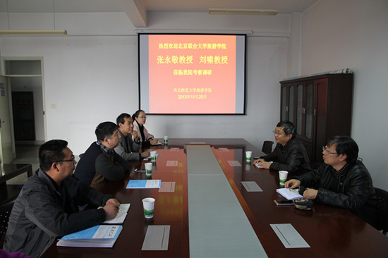 11月20日上午,北京联合大学2018太阳集团网站古天乐科学技术科与研究生处处长张永敬教授、刘啸教授到学院调研。学院党委书记贾志斌、院长把多勋教授、副院长梁旺兵教授、文化产业管理系主任王力等在文化产业管理系办公室参加调研座谈会。