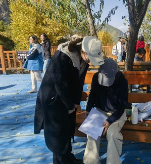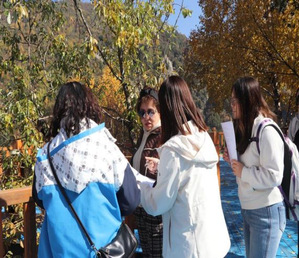 在前往大墩峡景区的大巴车上,同学们模拟导游讲解了积石山县的历史文化与地理环境、景区的旅游资源及产品特色等。到达景区后,老师们融入“绿水青山就是金山银山”理念,再次强调了实践教学的内容以及安全注意事宜,随后师生们便沿景区木质栈道开始爬山。途中,同学们不时驻足记录拍摄景区的地形地貌、植被与山林美景。在休憩点,大家围绕旅游资源保护与游憩开发的平衡点、 旅游产品开发的生态化创新路径、旅游承载力约束下的开发策略、构建“文化+功能”导向的标识系统等方面展开热烈讨论。为更好地了解游客对大墩峡景区的感受,学生们对景区内游客进行了访谈和问卷调查,就景区的观赏价值、景观特色、文化内涵与交通便利性、指示牌完善度、休息设施、安全措施及环境卫生等方面进行了深入交流。