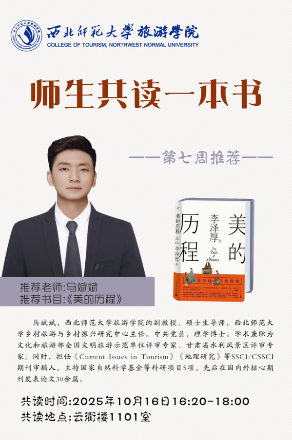 10月16日下午,本学期第一次师生共读活动如期开展。马斌斌老师结合自身专业背景,为同学们推荐李泽厚先生的经典著作《美的历程》。活动中,同学们结合旅游场景中文化资源的挖掘与呈现,分享阅读感悟,在思想碰撞中拓宽认知边界,深化对 “美” 的理解与传承意识。