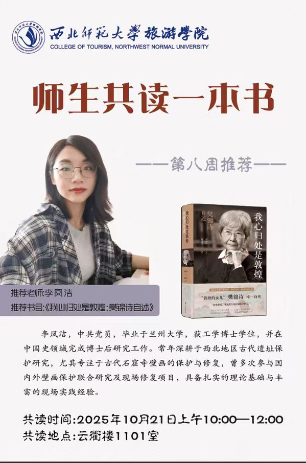 10月21日上午,本学期第二次师生共读活动在云衢楼1101室顺利举行。李凤洁老师以《我心归处是敦煌:樊锦诗自述》为共读内容,活动中,她结合自身对文化遗产保护与旅游管理领域的研究经验,解读书中蕴含的文化传承精神,引导同学们思考旅游专业人才在文化遗产保护与活化利用中的使命与价值。形成 “师生共读、教学相长” 的良好氛围。