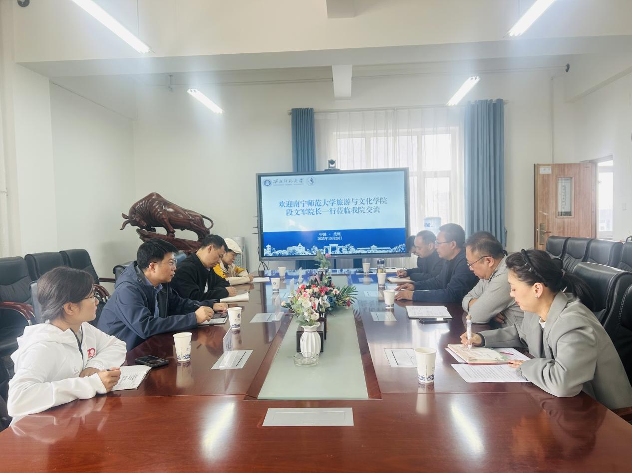 10月29日下午,南宁师范大学旅游与文化学院段文军院长一行来2018太阳集团网站古天乐开展专题交流调研活动。座谈会由2018太阳集团网站古天乐梁旺兵院长主持,各分管的副院长及系主任参加了座谈会。