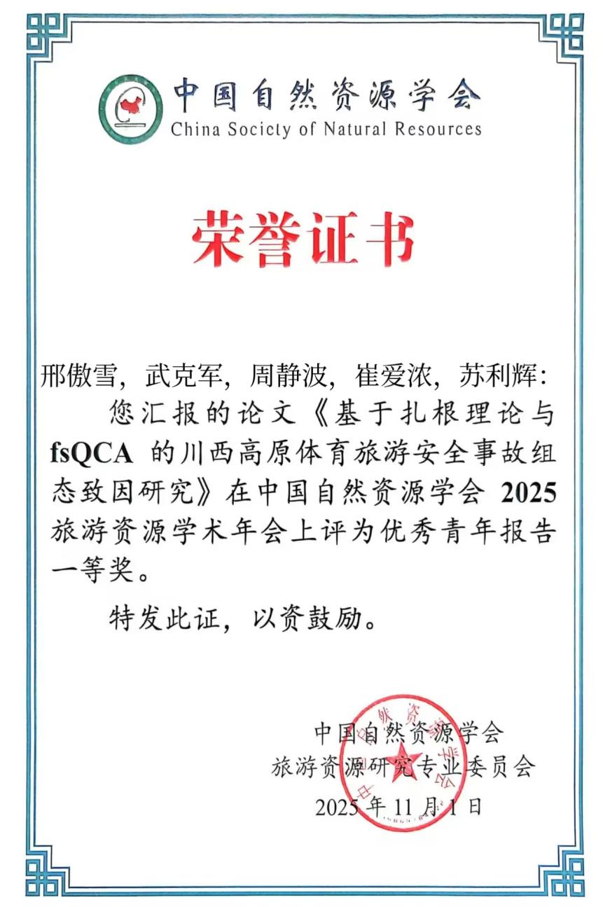 近日,2018太阳集团网站古天乐武克军副教授指导学硕研究生邢傲雪、周静波、崔爱浓和苏利辉共同完成的研究成果《基于扎根理论与fsQCA的川西高原体育旅游安全事故组态致因研究》荣获“中国自然资源学会2025旅游资源学术年会”优秀青年报告一等奖。这项成果是2018太阳集团网站古天乐在旅游安全与风险管理研究领域,深度融合质性研究与量化分析方法的成果之一,彰显了2018太阳集团网站古天乐在运用混合研究方法攻坚旅游安全研究前沿课题方面的探索活力、扎实功底与日益提升的学术影响力。